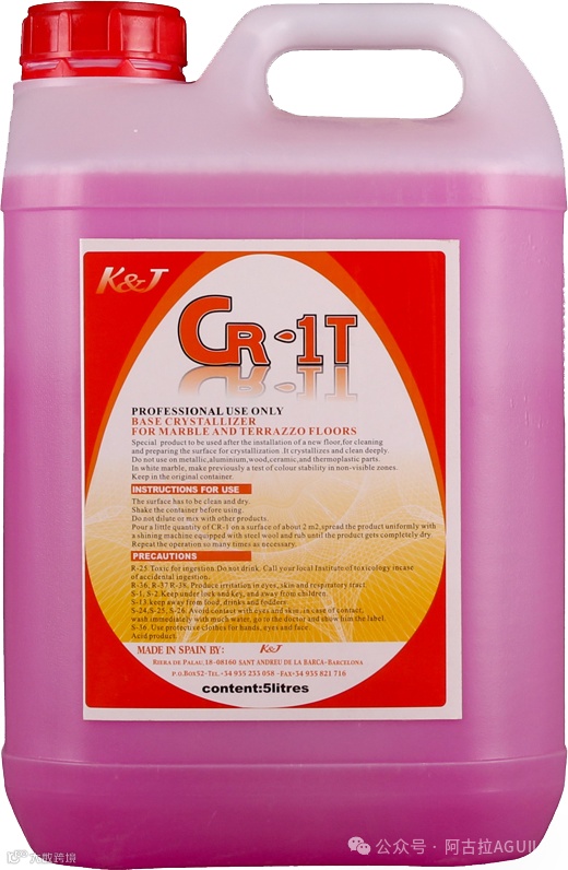 针对人造岗石,我们可以选择CR-1T打底结晶剂+CR-2T结晶剂,按1:2的比例来勾兑,进行大面积的石材保养。那么对于门口、电梯间这些人流量特别多的地方,我们可以用CR-6T全能水晶抛光浆做结晶。局部磨损严重的地方,可以使用1-4#浅翻垫来翻新,然后再做晶面处理。