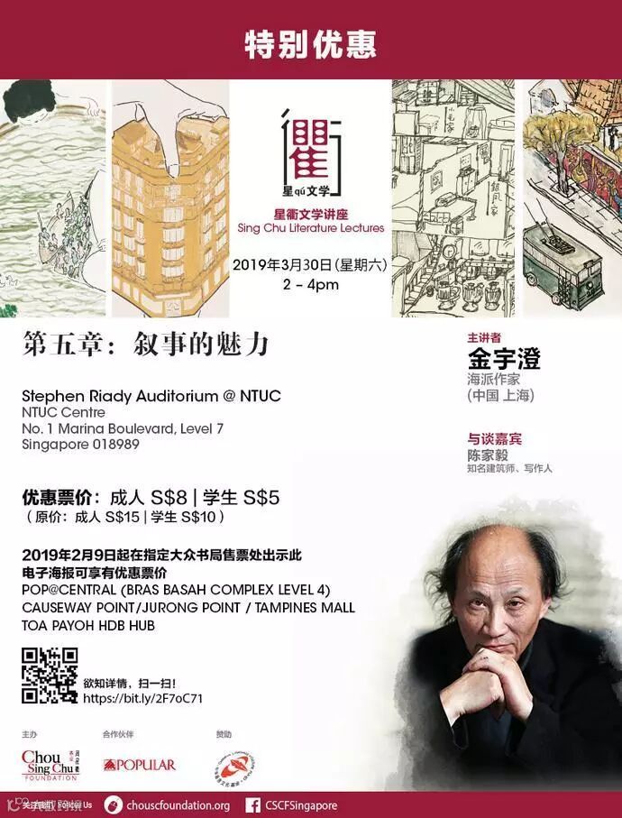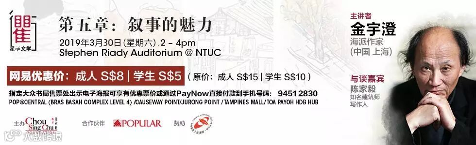 购票方式方式一:主办单位周星衢基金接受PayNow付款:1)通过PayNow直接支付,手机号码:984132062)主办单位收到付款后,会确认所显示的付款人的名字3)讲座当日(3月30日下午1点半)到现场凭手机里收到的SMS付款信息取票周星衢基金网站链接链接