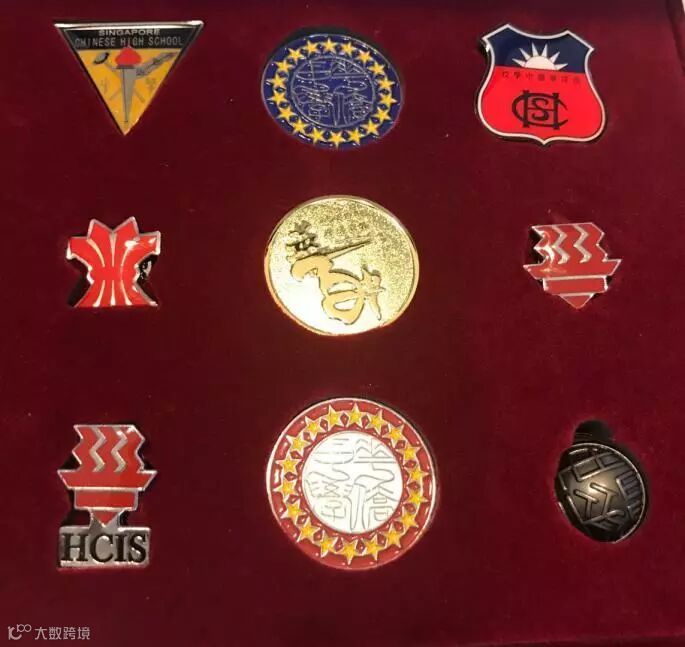 上排左起:使用最长的校徽(1930-2004);北洋政府时代校徽,北洋的星星乃中国传统的十八行省。字体是(上下右左)“華僑中學”。;定都南京后的校徽(直到1930改三角形校徽)。