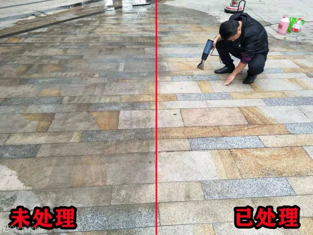 第二、待地面清洁干净并完全干燥后涂刷防护剂,使用“SB-2毛面石材防护剂”,可达到防污的效果同时还不改变石材的颜色。