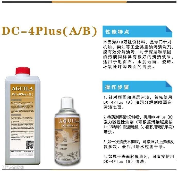 可使用“DC-1酸性强力除渍剂”或“强力化油剂”,用刷地机配“研磨刷”清洗地面,如深层油污(动植物油)可使用“DC-13除油膏”进行深度清洁,机油、柴油则选择“DC-4Plus(A/B)”进行深度清洁。