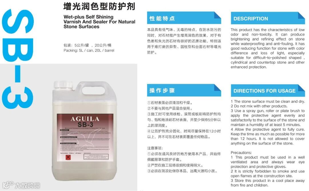 第三、使用“SB-3增光润色型防护剂”在防水防污的同时,给石材产生增亮润色的效果。