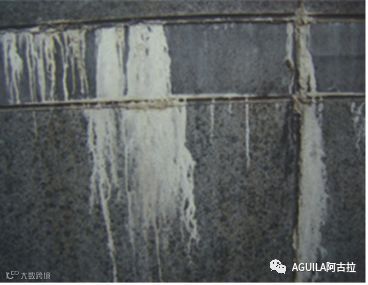 从石材的拼接缝隙中渗出,呈向下流挂白色条纹状。