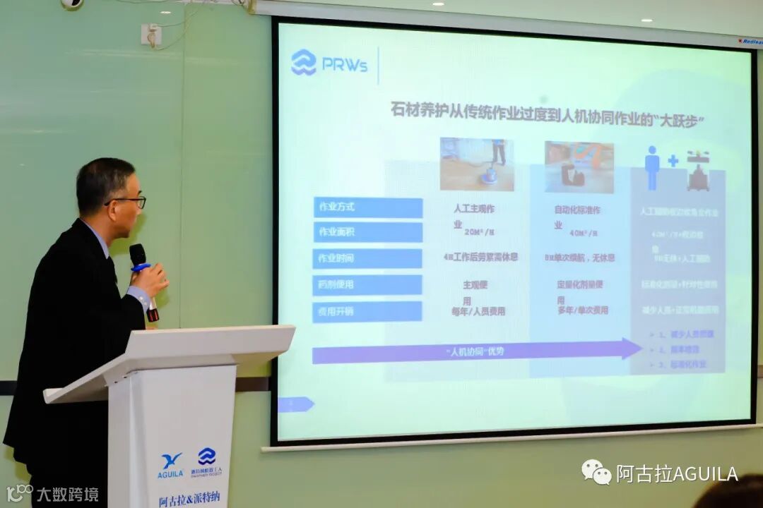 这种新型的人机协同作业方式在效率和成本方面已经明显优越于传统人工作业方式,使石材保养实现了量和质的飞跃。孔总通过大量的落地场景和案例进一步阐明了人机协同作业模式的特点和优势。