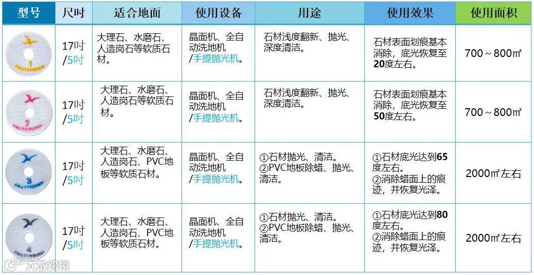以往我们会采用磨片(规格:4寸/片),根据石材表面受损的程度来确定深度、中度、浅度的翻新工艺和流程,由于采用磨片翻新的施工工艺较复杂,技术要求较高,若掌握不好,石材表面很容易留下研磨的痕迹、并且效率较低,因此使石材翻新的成本相对较高。