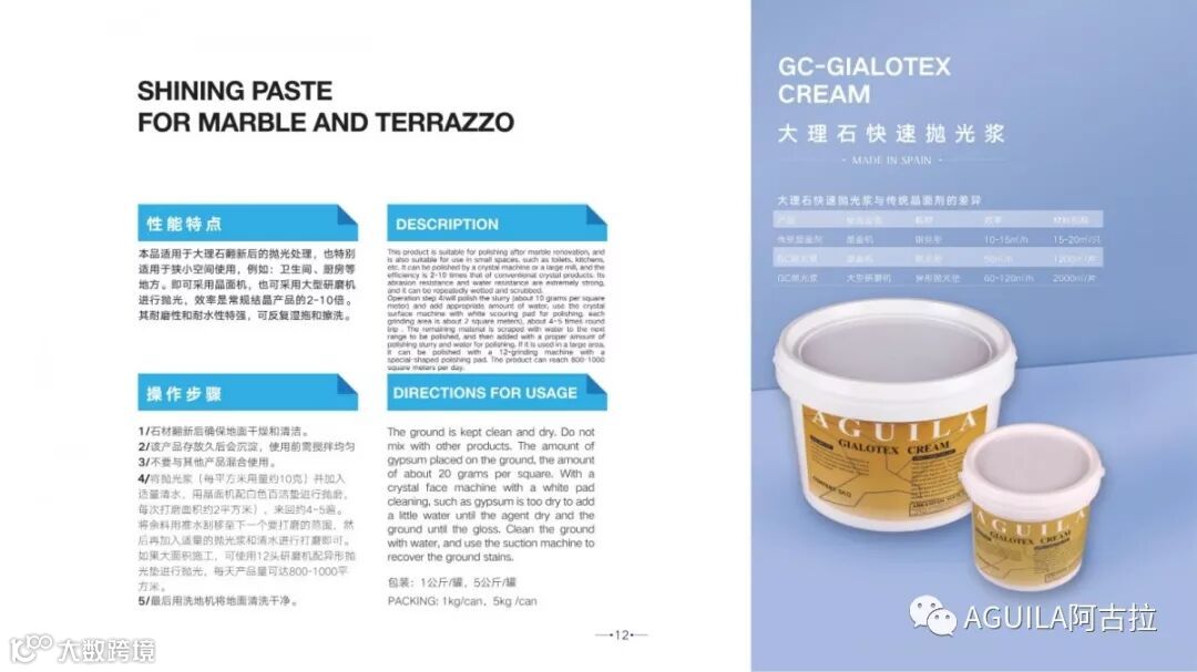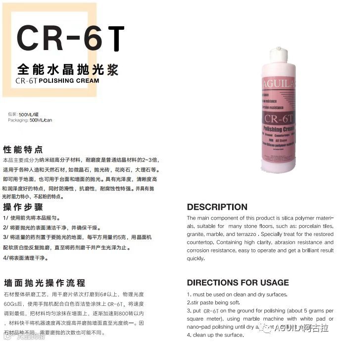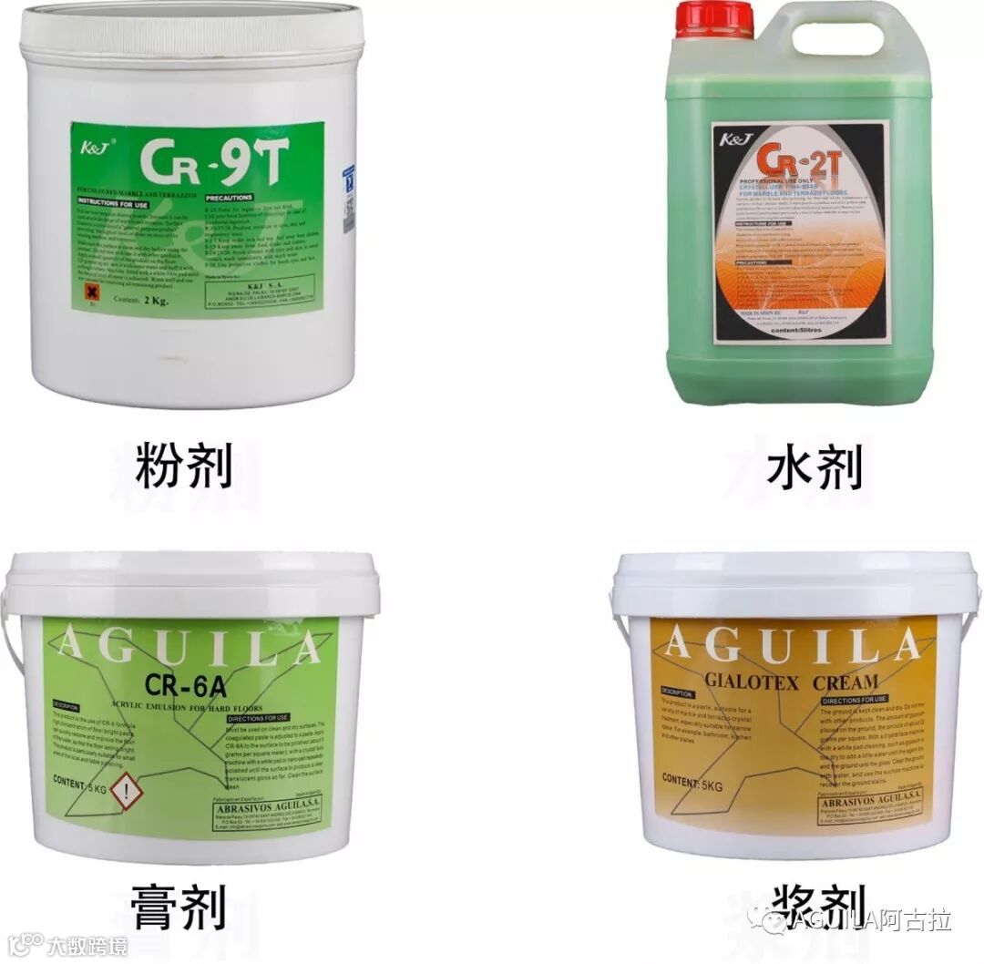 主要成分也是二氧化硅,只是黏稠度比结晶膏低些,偏中性(PH5~7)西班牙阿古拉的结晶浆分为湿磨浆和干磨浆,顾名思义湿磨浆是要添加水来打磨的,而干磨浆只需用白色百洁垫抛干即可。