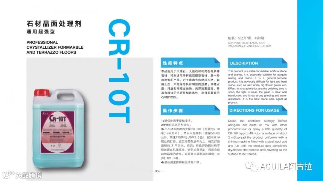 主要成分为酸性化合物,并含有一些蜡质。由于结晶剂的酸性相对较低(PH3~4), 以及具有以下特性,因此我们建议主要用于大理石的日常保养。