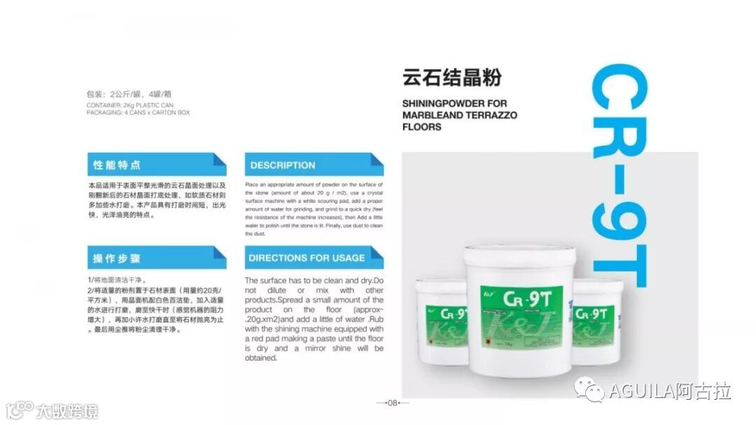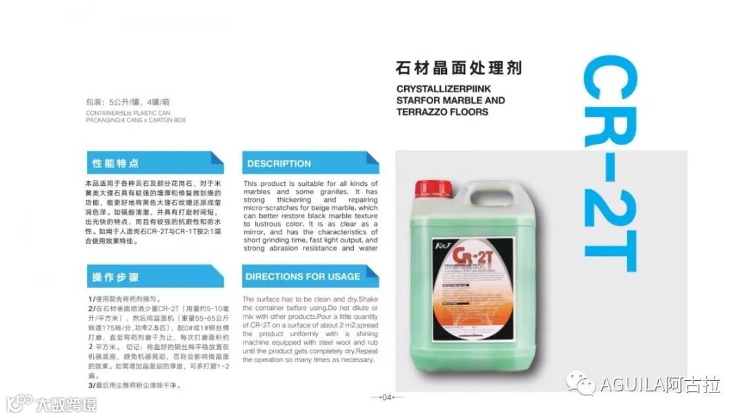 刚翻新完的大理石,由于碱性物和污物较多,使用结晶粉可起到酸碱中和以及清洁的作用,令结晶面更加清澈,同时对于研磨后底光较差的大理石具有较好的提光效果。
