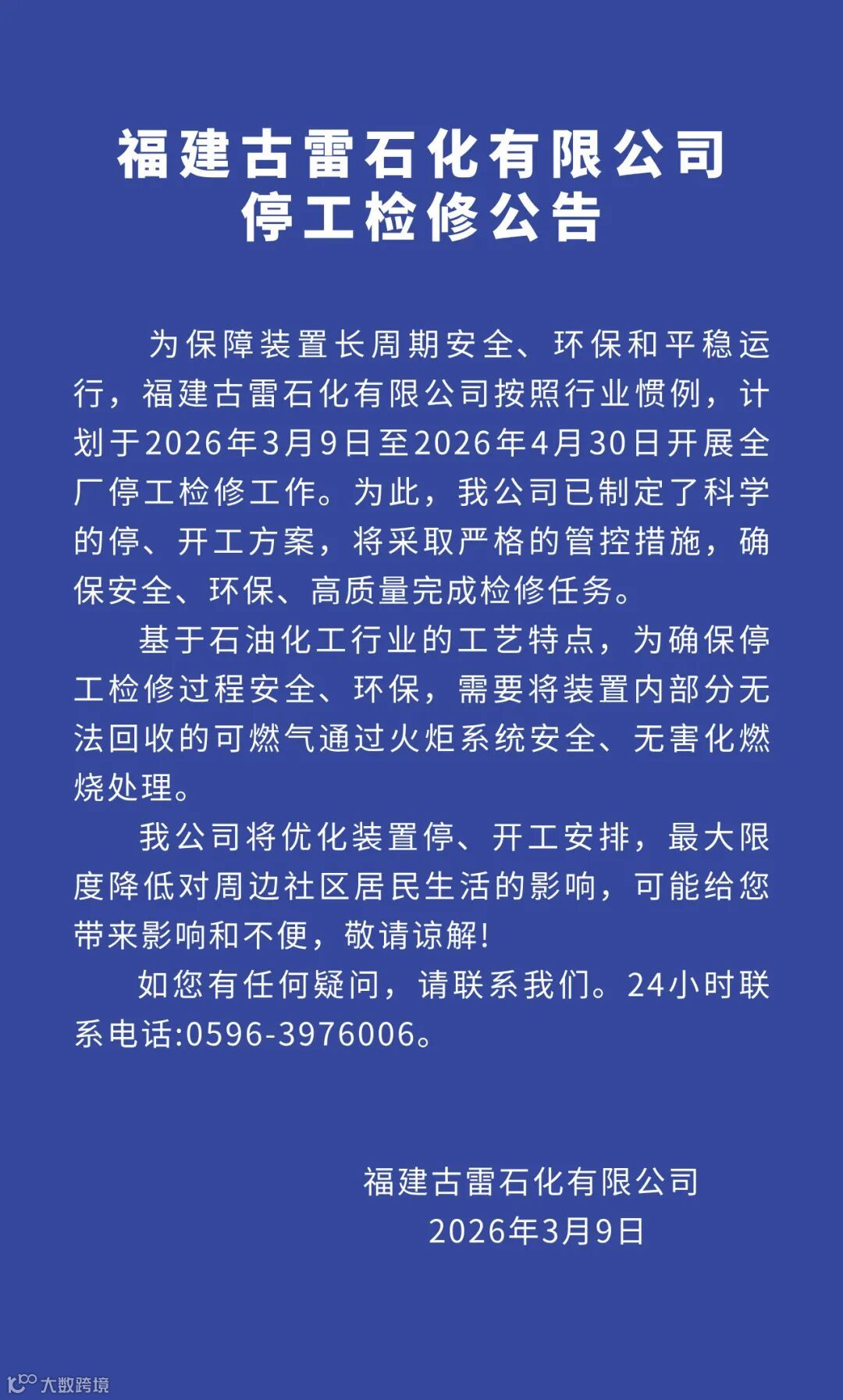2026年3月9日,福建古雷石化有限公司正式发布公告,启动公司成立以来首次全厂停工检修,检修周期3月9日至4月30日,共计53天 。