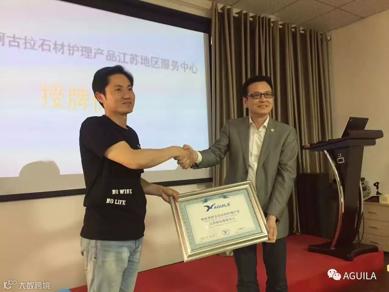 午餐过后,由西班牙阿古拉化工有限公司(大中华区)总经理陈俊杰先生向南京小草云石护理有限公司总经理贺文武先生进行“西班牙阿古拉石材护理产品江苏地区服务中心”授牌仪式。随着阿古拉江苏地区服务中心的成立,该地区的客户将得到更便捷、更优质的服务。