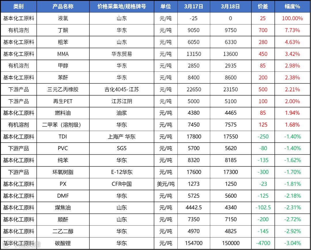 主要化工产品涨跌排行榜