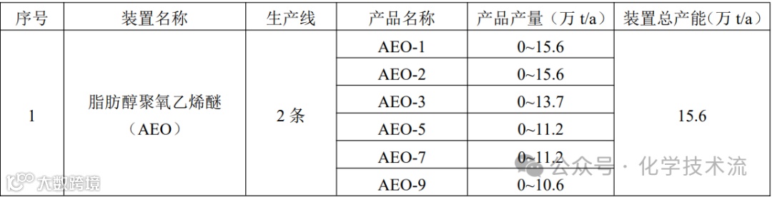 本项目生产装置(单元)年操作时间 8000 小时,AEO 系列产品柔性化生产,装置总产能不超过 15.6 万吨/年。本项目两条生产线同步运行,生产同一种产品。