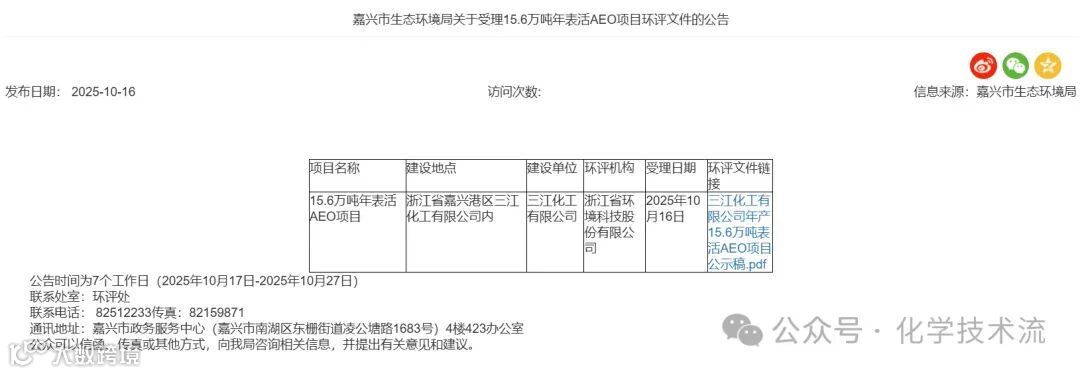 近期,嘉兴市生态环境局发布了三江化工有限公司15.6万吨年表活AEO项目环境影响报告书受理的公示。