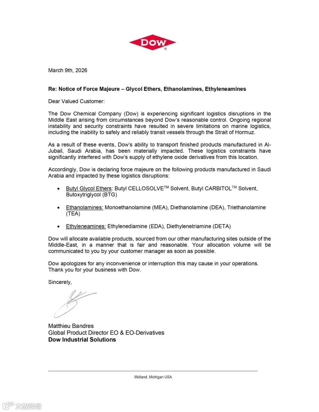 3月9日,陶氏化学发布关于乙二醇醚类、乙醇胺类、乙烯胺类产品的不可抗力通知,通知显示,以下在沙特阿拉伯生产、受此次物流中断影响的产品遭遇不可抗力: