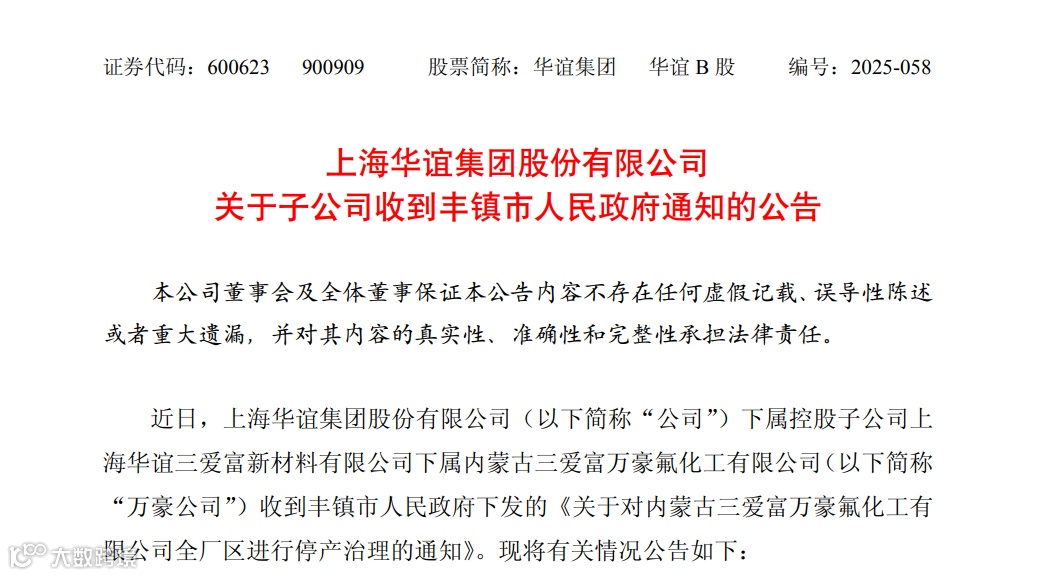 近日,上海华谊集团股份有限公司(以下简称“华谊集团)下属控股子公司上海华谊三爱富新材料有限公司下属内蒙古三爱富万豪氟化工有限公司(以下简称“内蒙古三爱富”)收到丰镇市人民政府下发的《关于对内蒙古三爱富万豪氟化工有限公司全厂区进行停产治理的通知》。