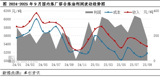 据卓创数据显示,2025年9月,国内炼厂综合炼油利润为167元/吨,环比降低174元/吨,降幅为50.99%;同比降低20元/吨,降幅为10.65%。炼厂综合理论利润环比降幅超一半,主要是炼油产品收入欠佳所致。除国际油价涨跌震荡使得多数炼油产品缺乏稳定成本支撑外,部分炼油产品“旺季不旺”的需求表现则是导致炼厂收入下滑的主要原因。