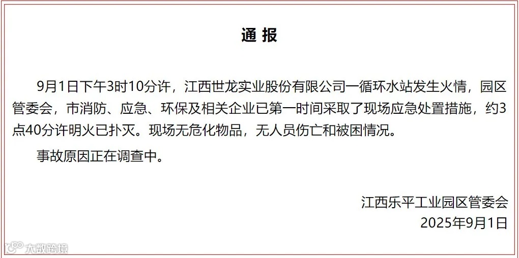 据江西乐平工业园区管委会通报:9月1日下午3时10分许,江西世龙实业股份有限公司一循环水站发生火情,园区管委会,市消防、应急、环保及相关企业已第一时间采取了现场应急处置措施,约3点40分许明火已扑灭。现场无危化物品,无人员伤亡和被困情况。事故原因正在调查中。