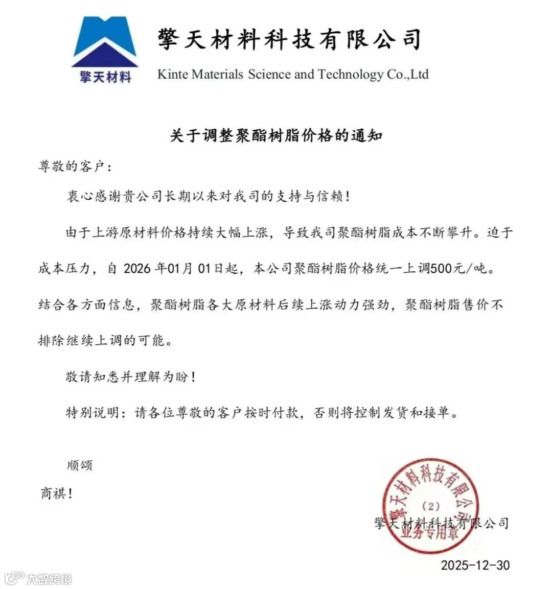 2025年12月30日,擎天材料表示,由于上游原材料价格持续大幅上涨,导致成本不断攀升。迫于成本压力,自2026年1月1日起,聚酯树脂价格统一上调500元/吨。且企业表示,聚酯树脂售价不排除继续上调的可能,请各位尊敬的客户及时付款,否则将控制发货和接单。