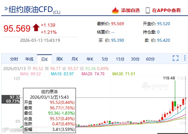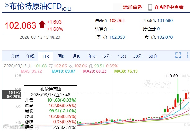 截止发稿,WTI原油报价95.57美元/桶,较昨日涨0.49%;布伦特原油报价102.06美元/桶,较昨日上涨0.35%,价格还在不断上涨中。