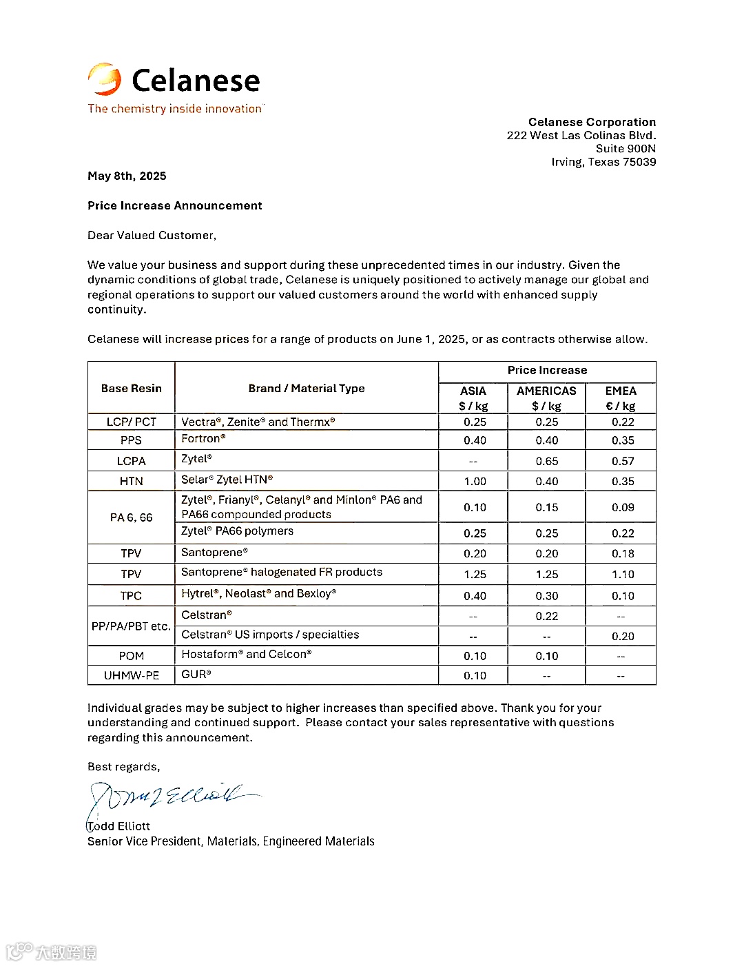 受地缘政治、关税政策及供应链成本上升影响,5月5日,塞拉尼斯宣布剥离其电子材料业务Micromax®,并再次上调工程材料产品价格。价格上调将于2025年6月1日正式生效,若合同另有约定,则按合同规定时间执行。