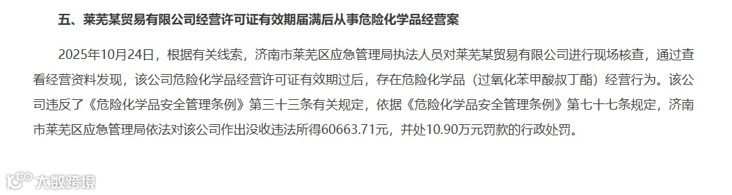 2025年10月24日,根据有关线索,济南市莱芜区应急管理局执法人员对莱芜某贸易有限公司进行现场核查,通过查看经营资料发现,该公司危险化学品经营许可证有效期过后,存在危险化学品(过氧化苯甲酸叔丁酯)经营行为。