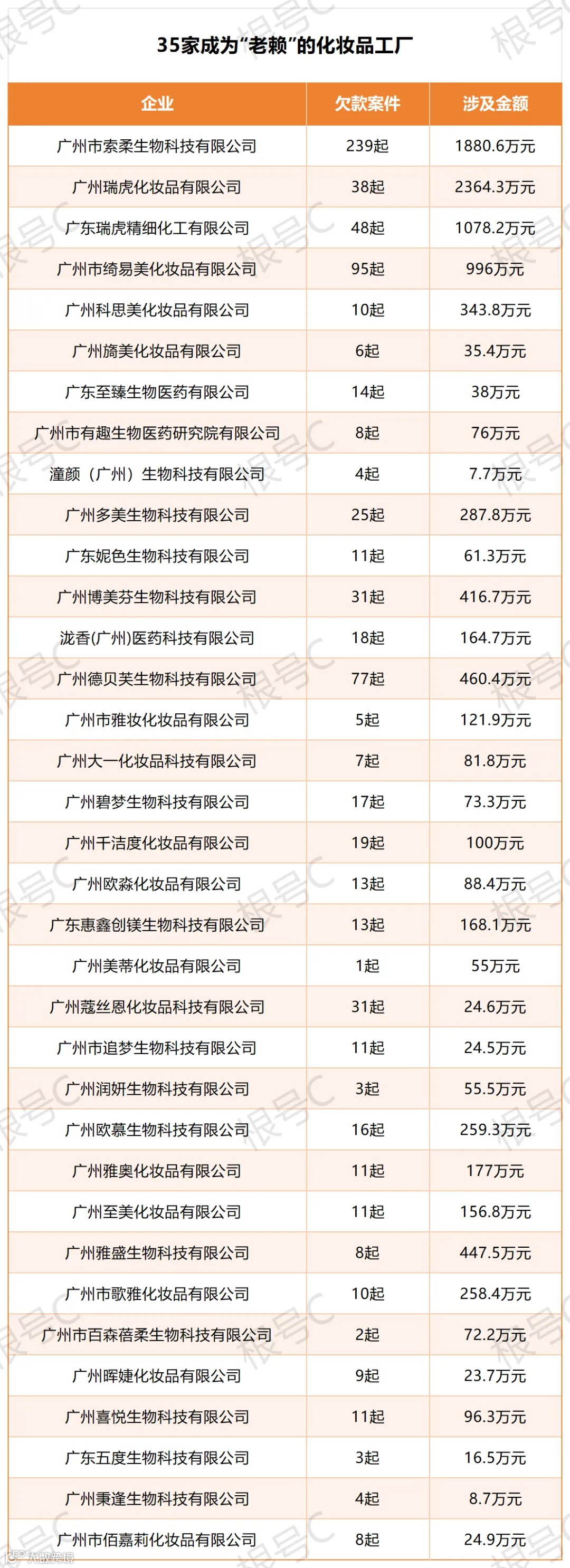 从金额来看,35家工厂企业总共欠款1.05亿元,平均每家300万元。其中仅广州瑞虎化妆品有限公司一家,就有多达2364.3万元的债务;而另一家化妆品工厂——广州市索柔生物科技有限公司,追讨债务的官司有多达239起,涉及金额1880.6万元。