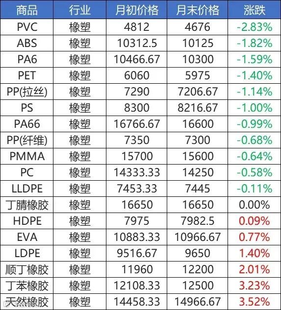 数据显示,8月大宗商品价格橡塑板块中环比上升的商品共6种;环比下降的商品共有11种,跌幅前3的产品分别为PVC、ABS、PA6。