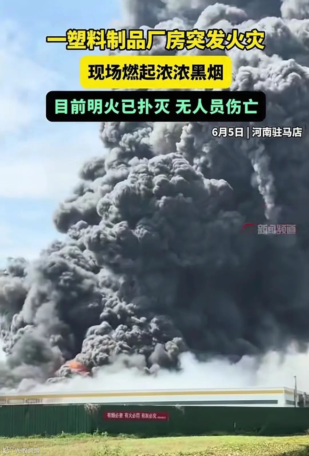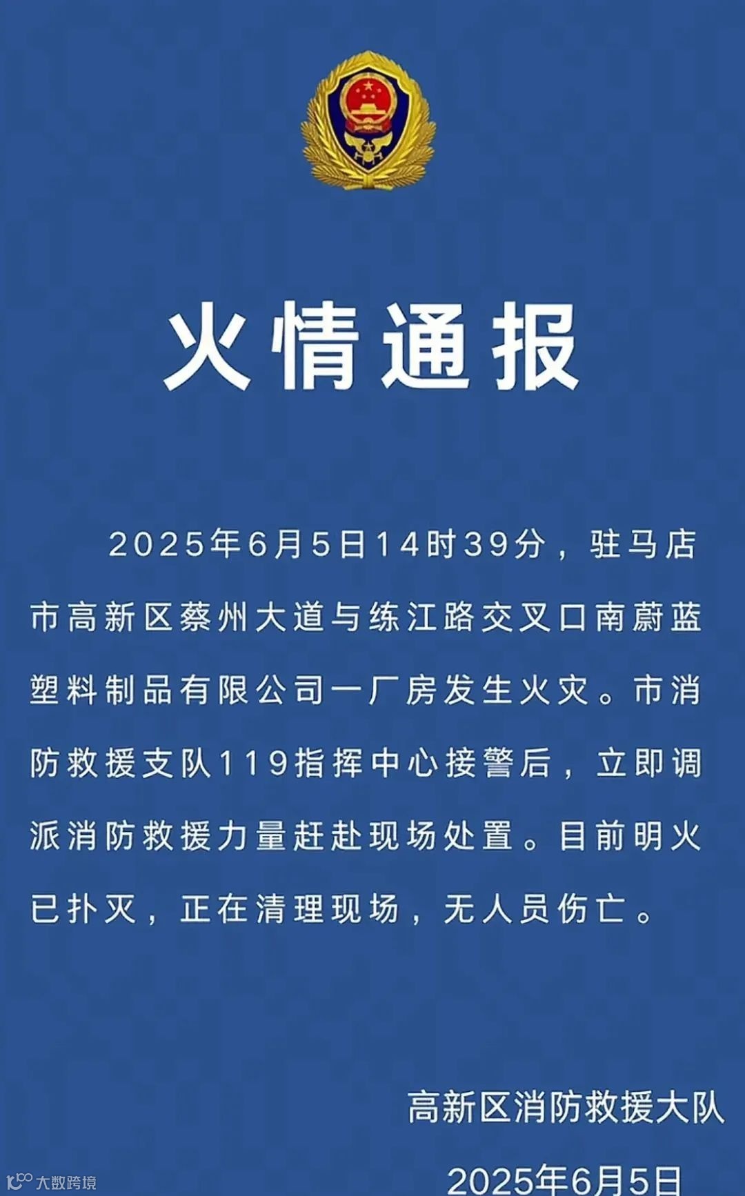 5日下午,驻马店高新区消防救援大队发布火情通报。通报称,2025年6月5日14时39分,驻马店市高新区蔡州大道与练江路交叉口南蔚蓝塑料制品有限公司一厂房发生火灾。市消防救援支队119指挥中心接警后,立即调派消防救援力量赶赴现场处置。目前明火已扑灭,正在清理现场,无人员伤亡。