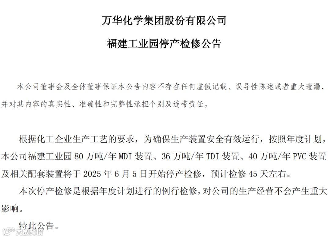 福建工业园检修计划:根据公告,福建工业园将于2025年6月5日开始进行为期约45天的年度例行检修。本次检修涉及80万吨/年MDI装置;36万吨/年TDI装置;40万吨/年PVC装置及配套装置。