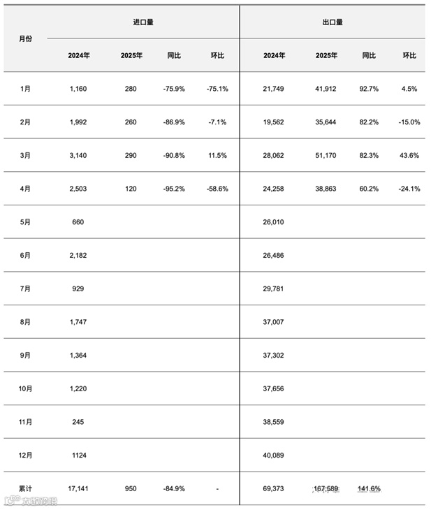 表1. 2024-2025年中国TDI进出口数据 (单位:吨)