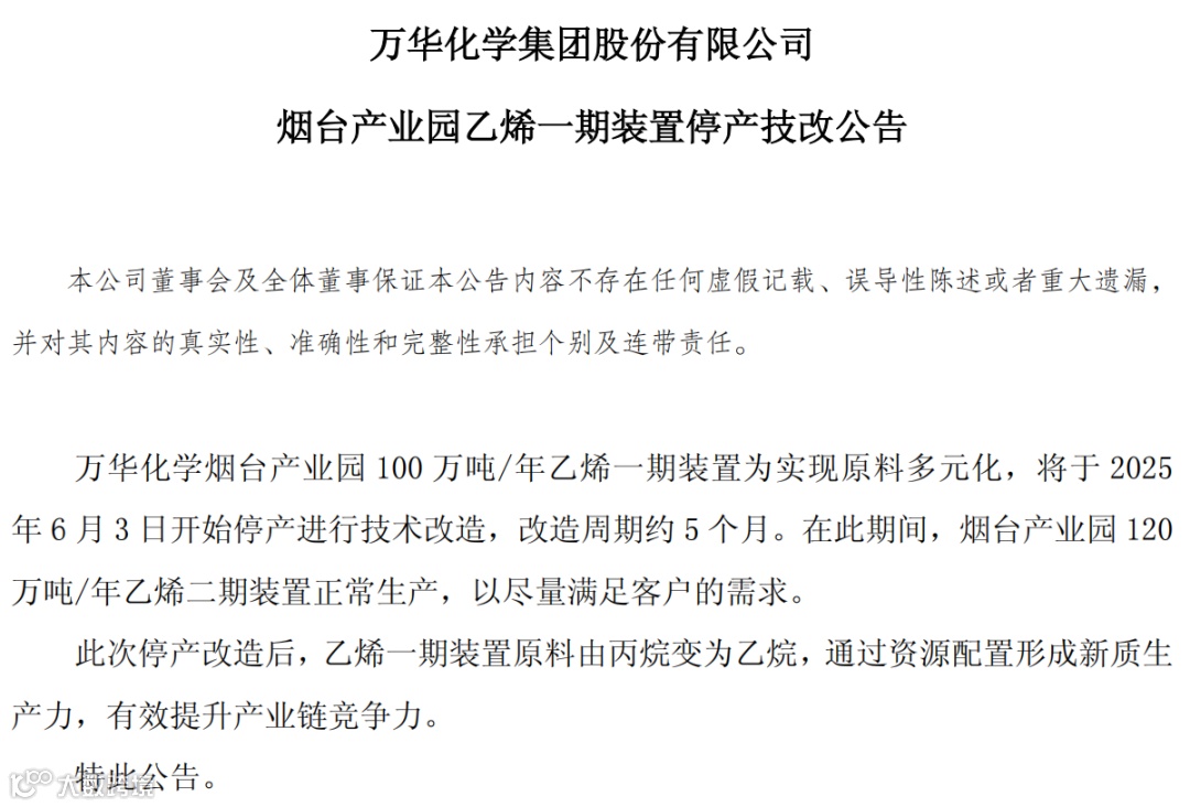 烟台产业园技术改造计划:烟台产业园100万吨/年乙烯一期装置为实现原料多元化,将于6月3日启动为期5个月的技术改造工程。此次停产改造后,乙烯一期装置原料由丙烷变为乙烷,通过资源配置形成新质生产力,有效提升产业链竞争力。在改造期间,烟台产业园120万吨/年乙烯二期装置将保持正常生产。