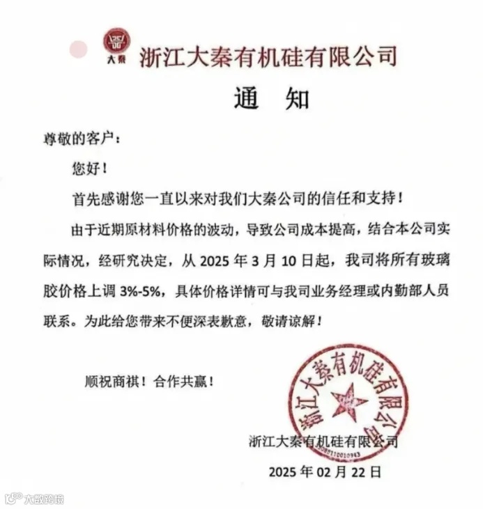 浙江大秦有机硅从3月10日起,所有玻璃胶价格上调3%-5%。