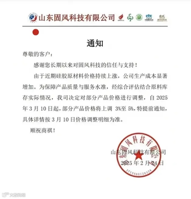 山东固风科技自3月10日起,部分产品价格将上调3%-5%。