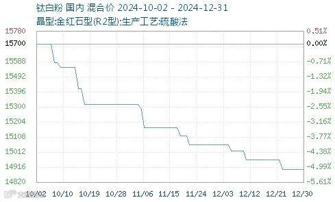 如今的报价较年内高值下跌超2000元/吨,跌幅约15%。今年以来,国内钛白粉市场整体呈下行走势,尤其是四季度以来价格持续下滑,最终在年末形成了较低的价格行情。