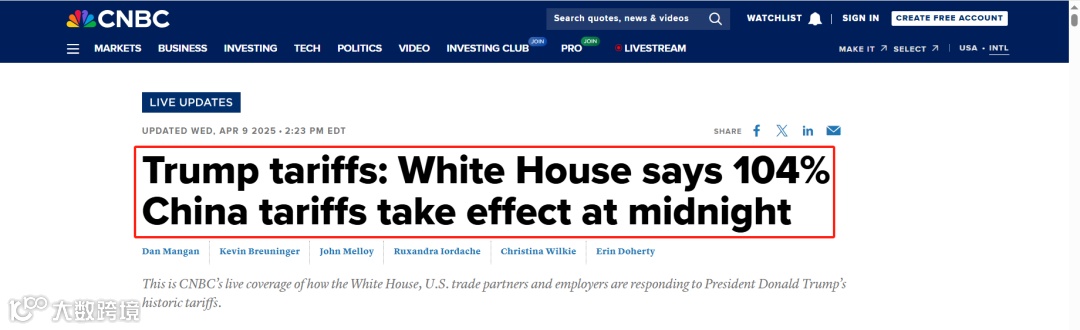 4月9日,美国白宫新闻秘书卡洛琳·莱维特宣布,美国将对中国征收104%的关税,该关税于美国东部时间中午生效,以回应中国对美国出口产品征收34%的关税。她进一步说明,新关税将从周三开始实施。