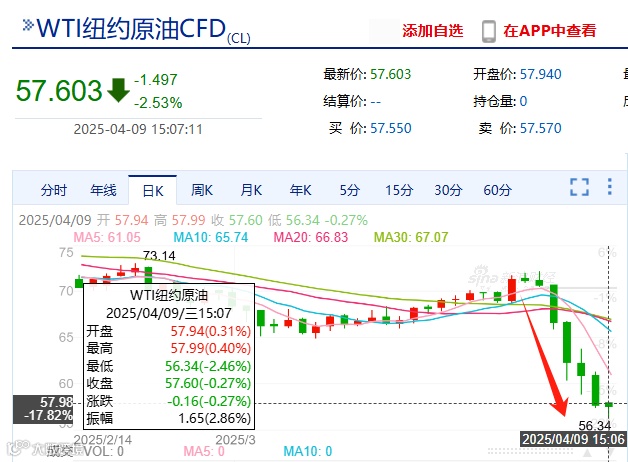 美国关税政策引发市场对全球经济衰退的担忧,原油作为主要风险资产未能幸免,广化君看了下今日的国际原油价格,毫无疑问也是大跌特跌,昨日,WTI原油大跌5%,截至发稿,WTI原油报价57.60美元/桶,跌0.27%;布伦特原油报价61.16美元/桶,跌0.73%,目前还在持续下探。