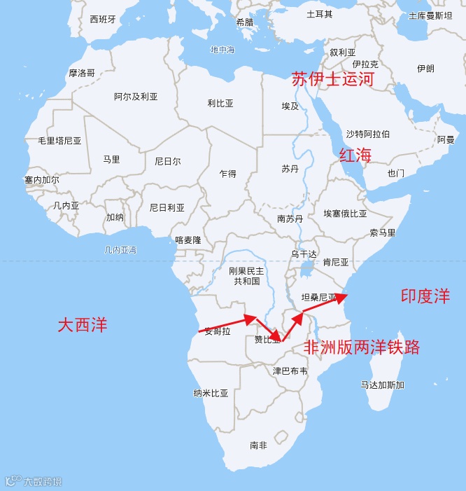 从上图可以看出这条铁路的重要性。它不仅可以把非洲内陆的资源运出来,把产品运进去,还可以某种程度上发挥苏伊士运河的替代作用。