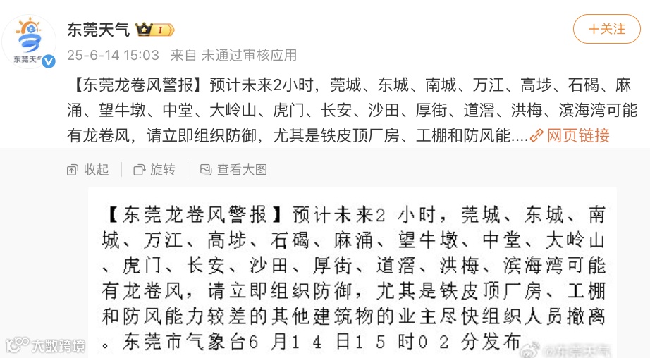 预计未来2小时,莞城、东城、南城、万江、高埗、石碣、麻涌、望牛墩、中堂、大岭山、虎门、长安、沙田、厚街、道滘、洪梅、滨海湾可能有龙卷风,请立即组织防御,尤其是铁皮顶厂房、工棚和防风能力较差的其他建筑物的业主尽快组织人员撤离。