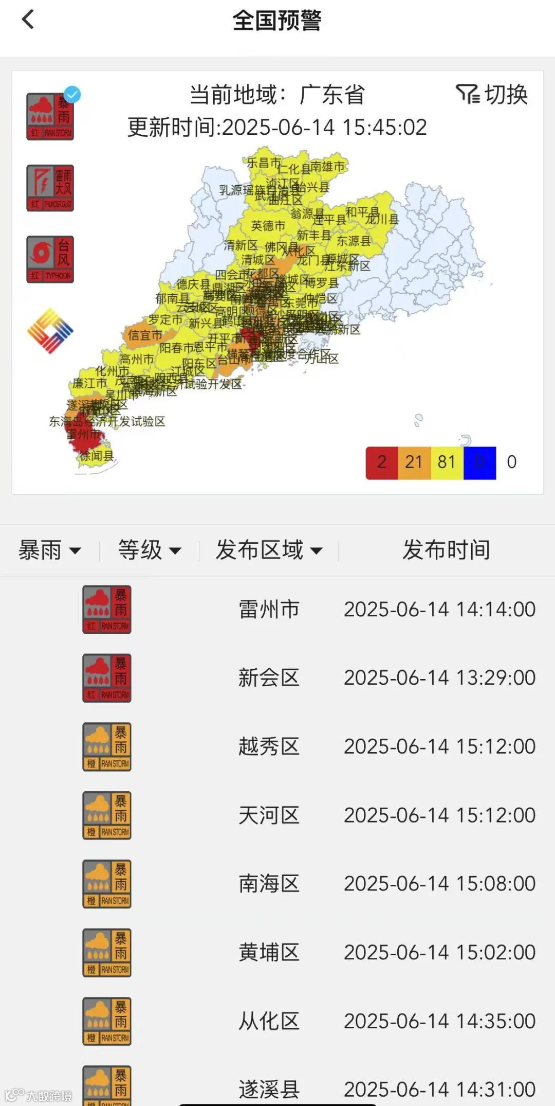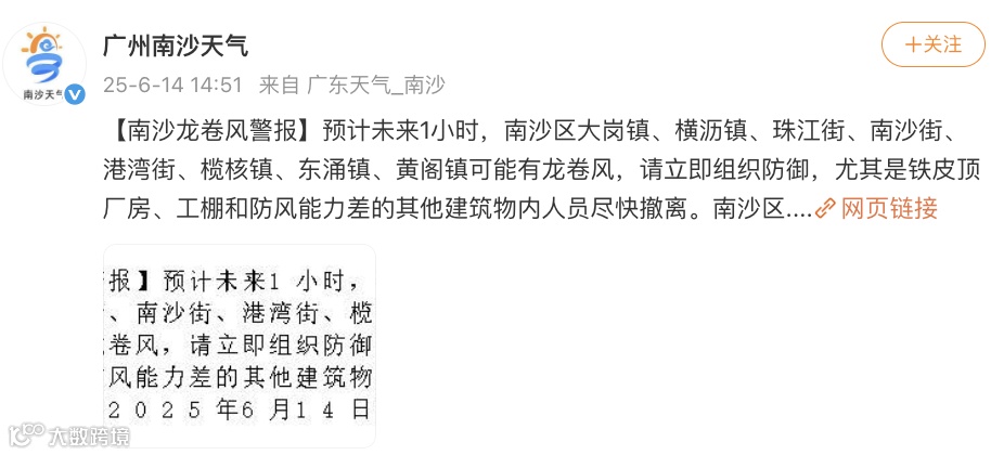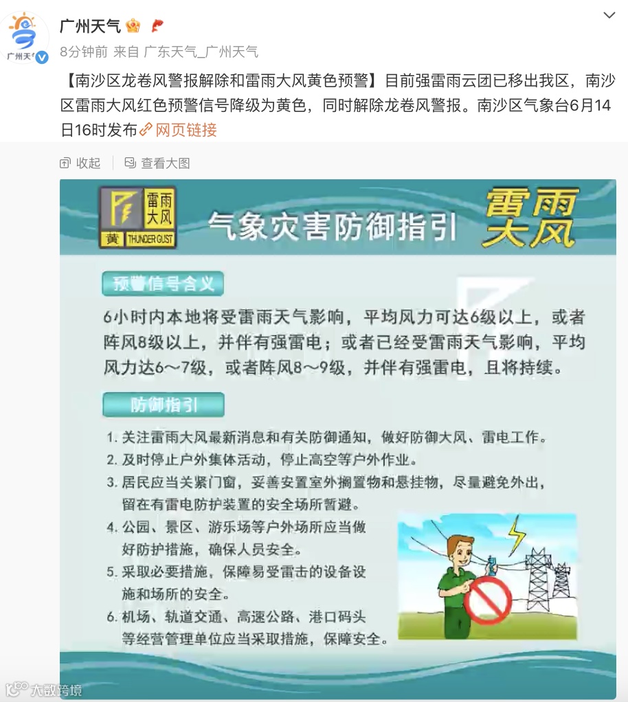 16时,南沙再次通报:目前强雷雨云团已移出我区,南沙区雷雨大风红色预警信号降级为黄色,同时解除龙卷风警报。