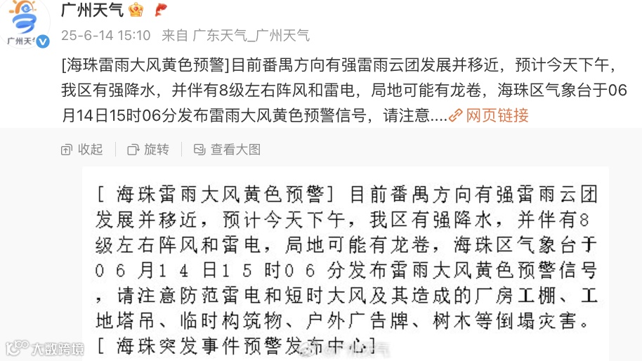 另据广州市气象台监测,广州市达到启动气象灾害(雷雨大风)Ⅳ级应急响应标准。市气象灾害应急指挥部决定从14日15时24分起启动广州市气象灾害(雷雨大风)Ⅳ级应急响应。请按照预案规定做好防御工作。