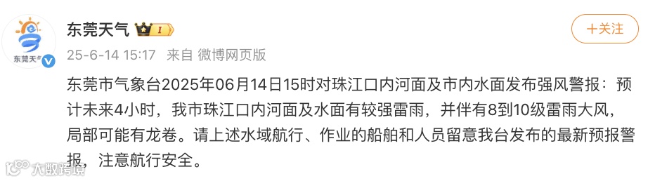 15时,东莞市气象台对珠江口内河面及市内水面发布强风警报: