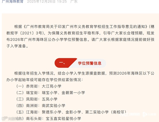 2026年广州市义务教育阶段学位供求情况如何?截至目前,粗略统计,广州已有七区发布了学位预警公告,包括海珠、天河、白云、花都、从化、黄埔、增城等超过80所中小学。其中,花都区首次发出学位预警。
