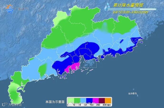 8-9日,珠三角和粤西先后有暴雨到大暴雨局部特大暴雨,粤东市县有大雨到暴雨局部大暴雨,其余市县有(雷)阵雨局部暴雨。最高气温:粤北市县32~34℃,其余市县28~32℃。