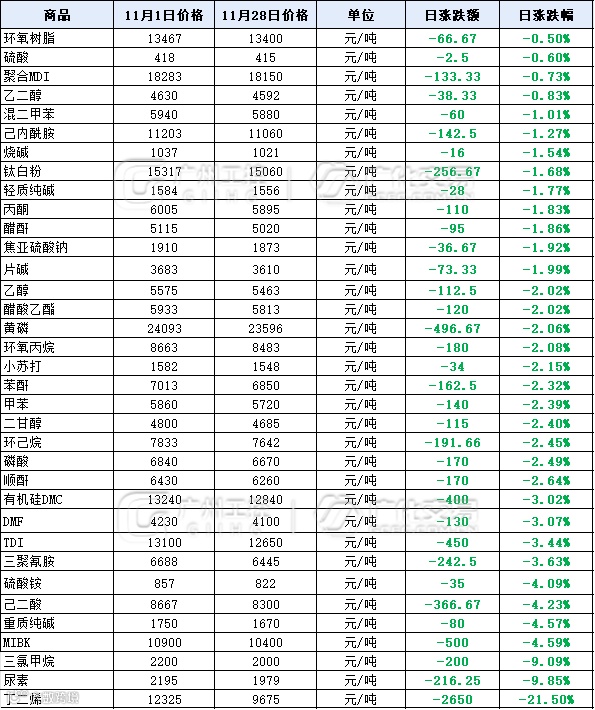 据广化君统计,近期有超30种原料出现价格下滑现象,其中丁二烯下跌超20%,月内价格跌2650元/吨!