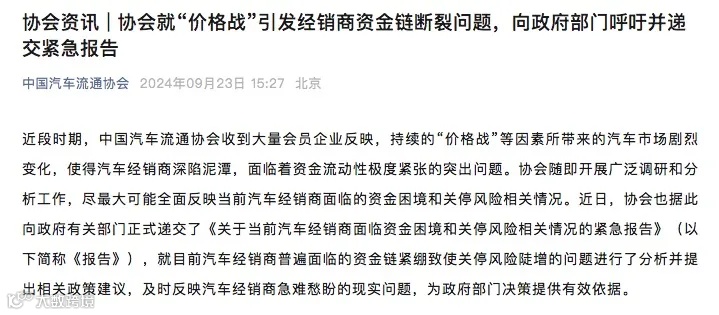 前段时间,中国汽车流通协会官微发文称,近段时期,协会收到大量会员企业反映,持续的“价格战”等因素所带来的汽车市场剧烈变化,使得汽车经销商深陷泥潭,面临着资金流动性极度紧张的突出问题。
