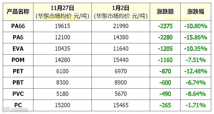 不只是中间的零部件供应商叫苦不迭,上游原料也是饱受摧残!就拿塑料来说,年内PA66、PA6市场均价已暴跌超过2000元/吨!EVA、POM吨价跌超千元!还有PET大跌870元/吨,PBT跌600元/吨…