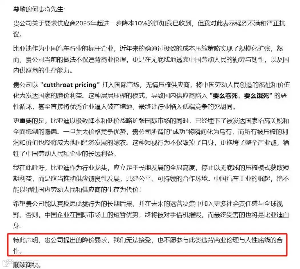 据《中国证券报》报道,11月27日,记者从供应链人士处获得一份供应商向比*迪的回信。供应商表示:“贵公司关于要求供应商2025年起进一步降本10%的通知我已收到,但我对此表示强烈不满和严正抗议。”