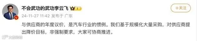 随后,比*迪集团品牌及公关处总经理李云飞在其个人微博上回应称:“与供应商的年度议价,是汽车行业的惯例。我们基于规模化大量采购,对供应商提出降价目标,非强制要求,大家可协商推进。”