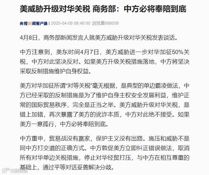 导读:据央视新闻消息,4月8日,商务部新闻发言人就美方威胁升级对华关税发表谈话。