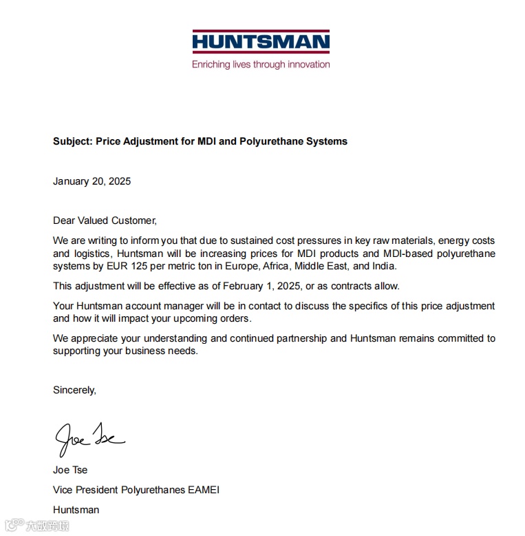 1月7日,巴斯夫宣布即日起,或在合同条款允许的情况下,巴斯夫将其在东盟和南亚的Lupranate®MDI MS等级的价格每吨提高300美元。1月10日,巴斯夫再次宣布,将其在东盟和南亚地区的Lupranate®TDI(甲苯二异氰酸酯)价格每吨提高300美元。